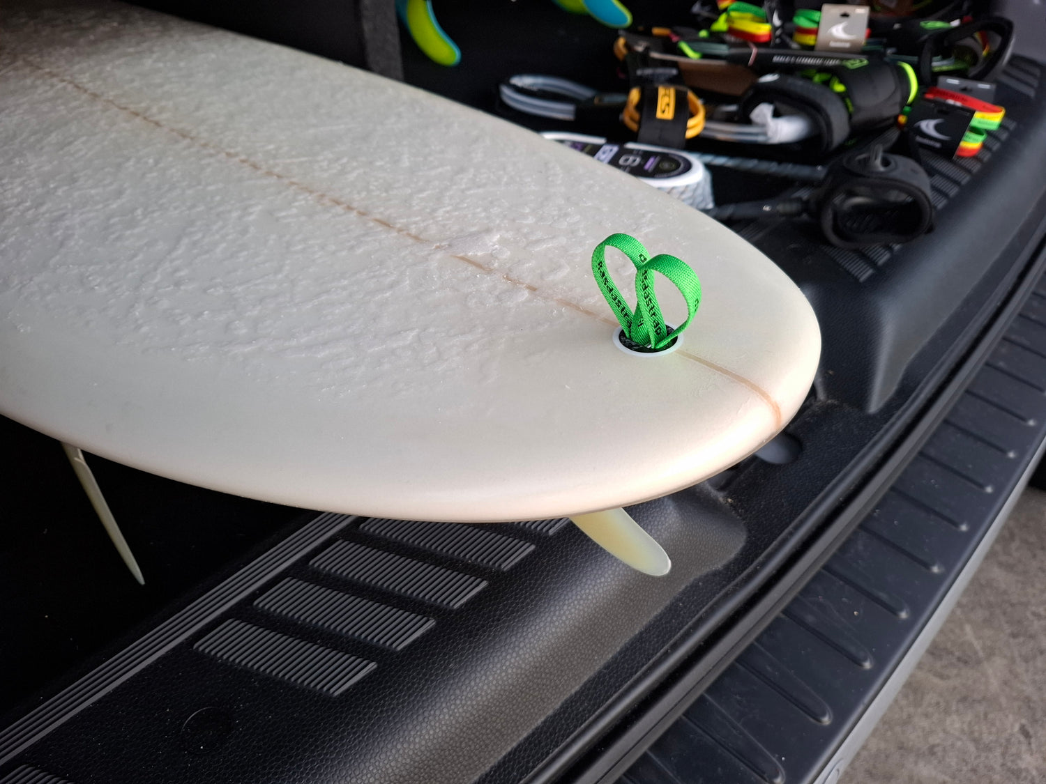 Simply thread your Rasdastrap through your deck plug and its job done ! Depending on your deck plug location, keep your rail saver in play by either keeping your Rasdastrap even length both sides of your deck plug, or thread your Rasdastrap back through itself.
